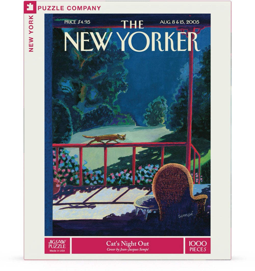 Bathed in moonlight and shadow, this evocative scene captures what cats do best—sneak, explore, and disappear into the night. In this 1000 piece jigsaw puzzle illustrated by Jean-Jacques Sempé, the silhouette of a curious cat stretches across a porch, illuminated by warm light and framed by bright red railings and a cozy wicker chair.